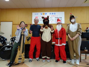 12月20日に毎月恒例の演奏会を開催しました。今回は記念すべき50回目の演奏会。ベースボランティアのお兄さんと職員によるバンドがサンタやトナカイの衣装で登場し会場は一気にクリスマスムードに包まれました。ボーカルはもちろん利用者の皆さん!賑やかな歌声が会場いっぱいに響き渡り心弾む最高のひとときとなりました。