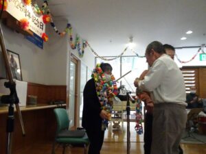当日は記念行事を開催。利用者代表の方から、故助宮啓介会長に「あとの郷をつくってくれてありがとう。美味しいごはんありがとう。楽しいキャンプありがとう。」と全員で考えた感謝の言葉が送られました。その後の楽器演奏では恒例の太鼓と鈴に加えて今回新たにカスタネットを使用し、いつも以上に活気のある演奏となりました。お楽しみの昼食は厨房手作りの華やかな祝膳。赤飯に天ぷら、茶碗蒸し等豪華な料理が並び、おいしいケーキとコーヒーで和やかなお祝いの日を締めくくりました。