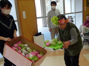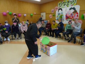 まず始めは「ひなあられ運びゲーム」。チームに分かれてひなあられに見立てたボールをうちわですくって運びます。たくさん運ぼうとして全部こぼしてしまったり、1個をゆっくり慎重に運んだりと皆さんの個性が光る楽しい時間となりました。その後のおやつタイムでは、コーヒーにお菓子、そして温かい甘酒でほっと一息。楽しい時間を過ごしました。