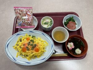 昼食はひな祭りメニュー。彩り豊かなちらし寿司に散らされた人参やお吸い物の中で揺れるお麩が可愛らしい花の形をしていてとても華やかでした。